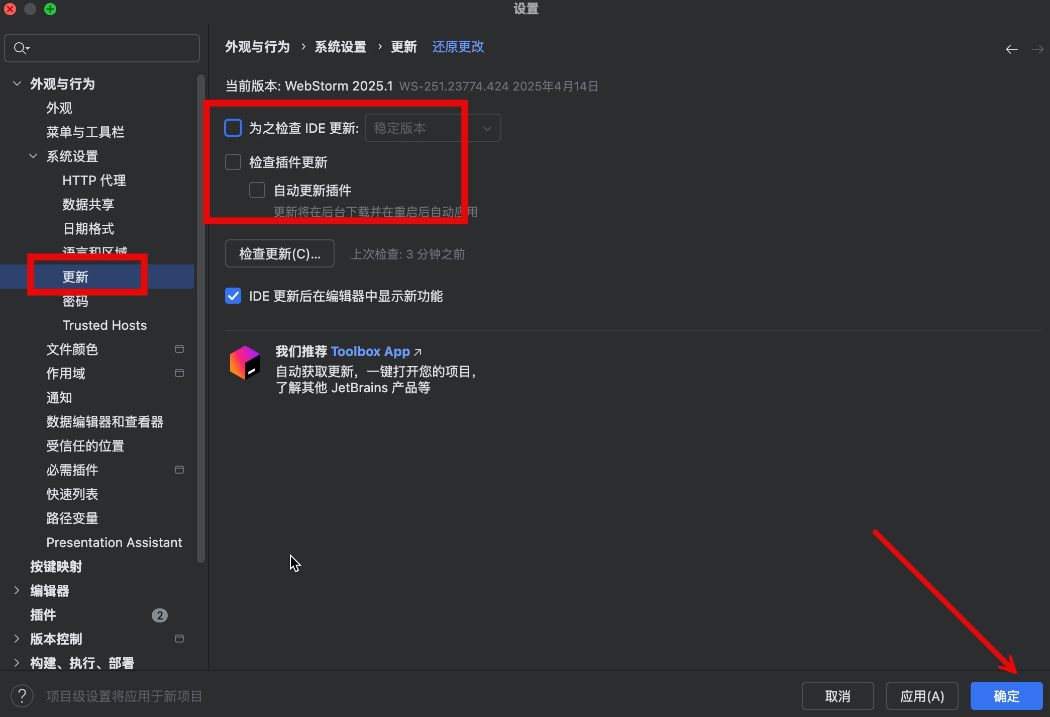 点击菜单栏的WebStorm,再点击settings…打开软件的偏好设置,左上角的搜索框处输入更新,取消勾选自动检测更新,然后点击确定