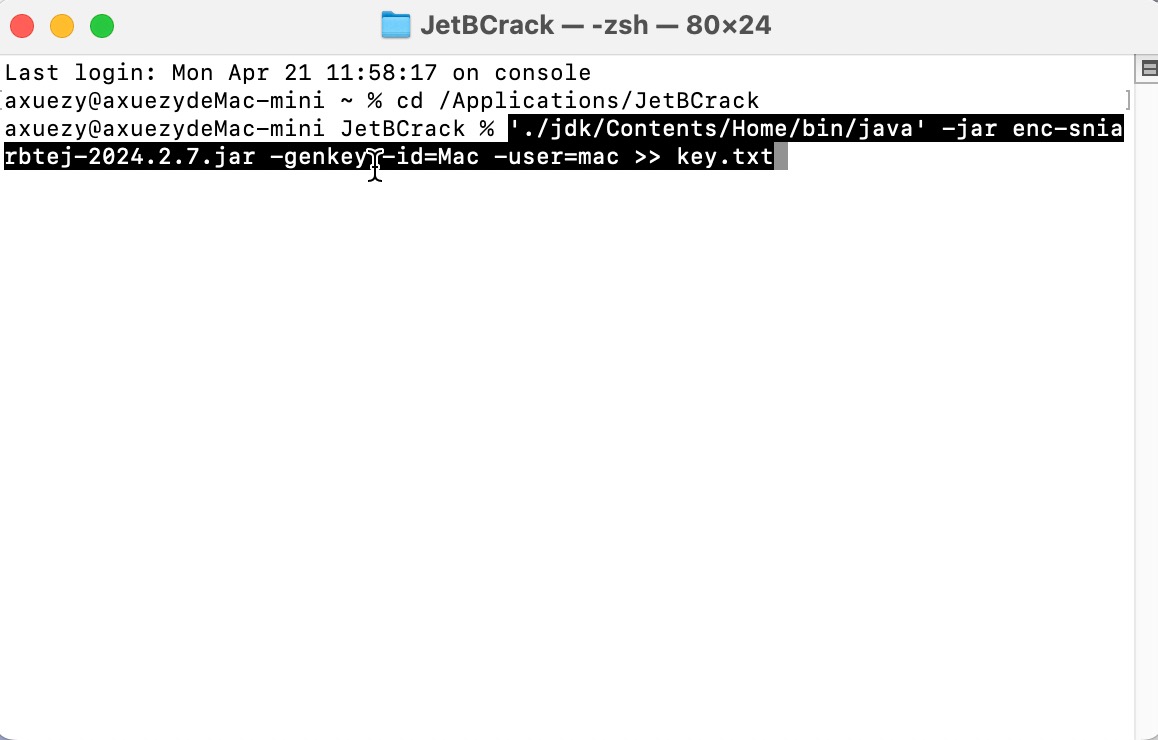 然后复制'./jdk/Contents/Home/bin/java' -jar enc-sniarbtej-2024.2.7.jar -genkey -id=Mac -user=mac >> key.txt后回车