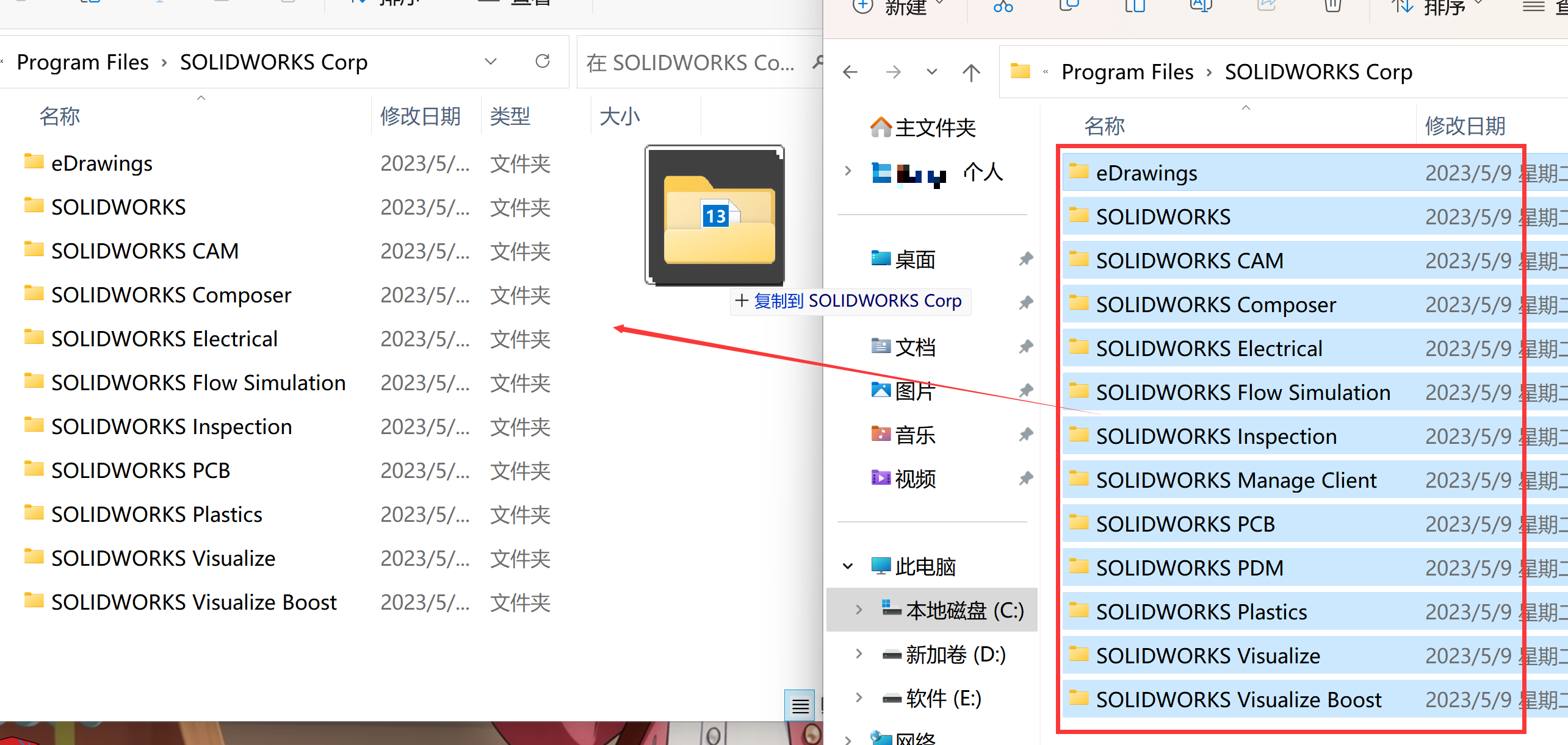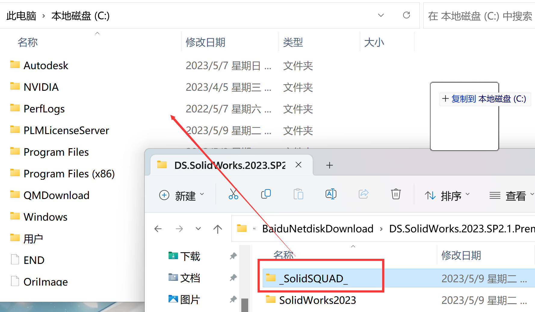 1、打开在本站下载好的SolidWorks2023安装包并解压,将电脑C盘打开,然后将安装包里面的_SolidSQUAD_文件夹复制到C盘里面去。