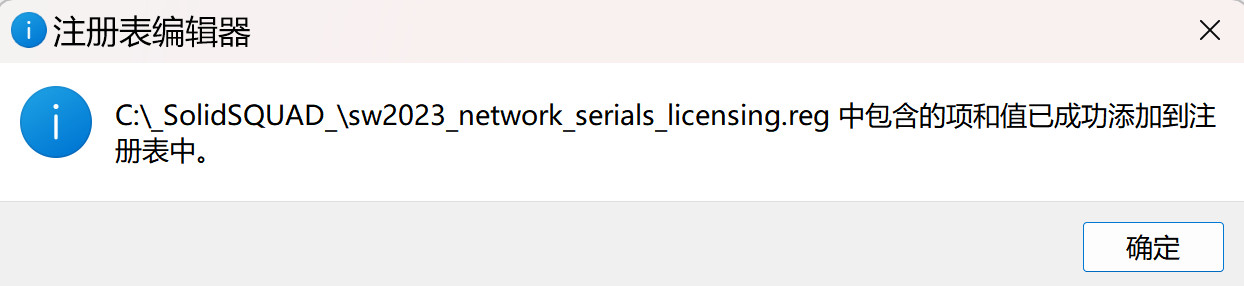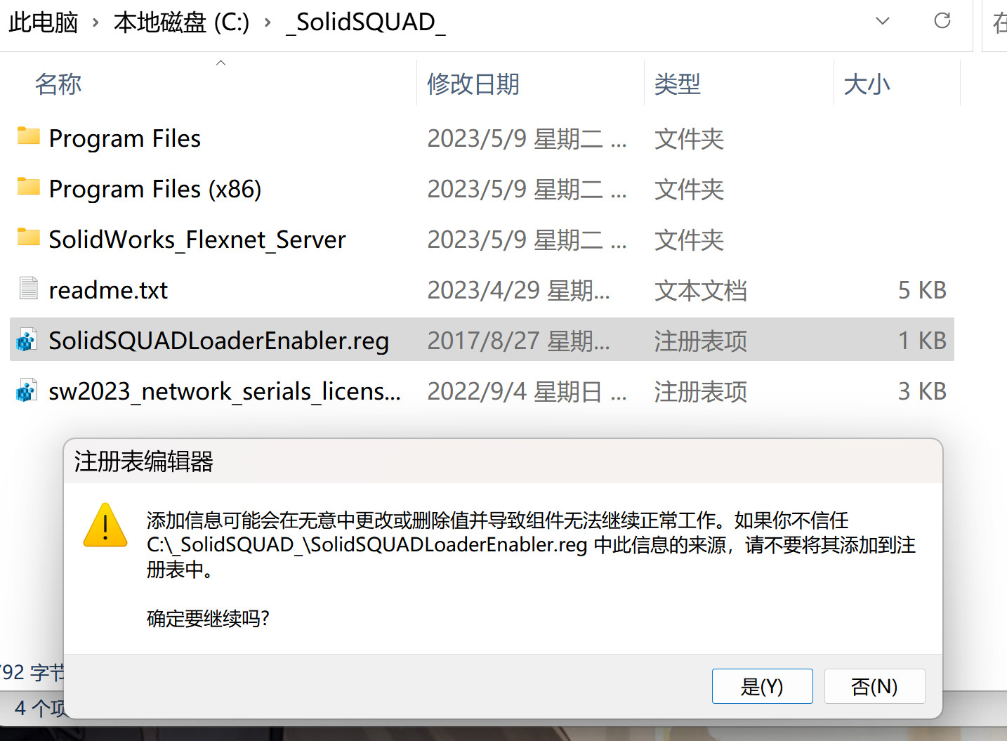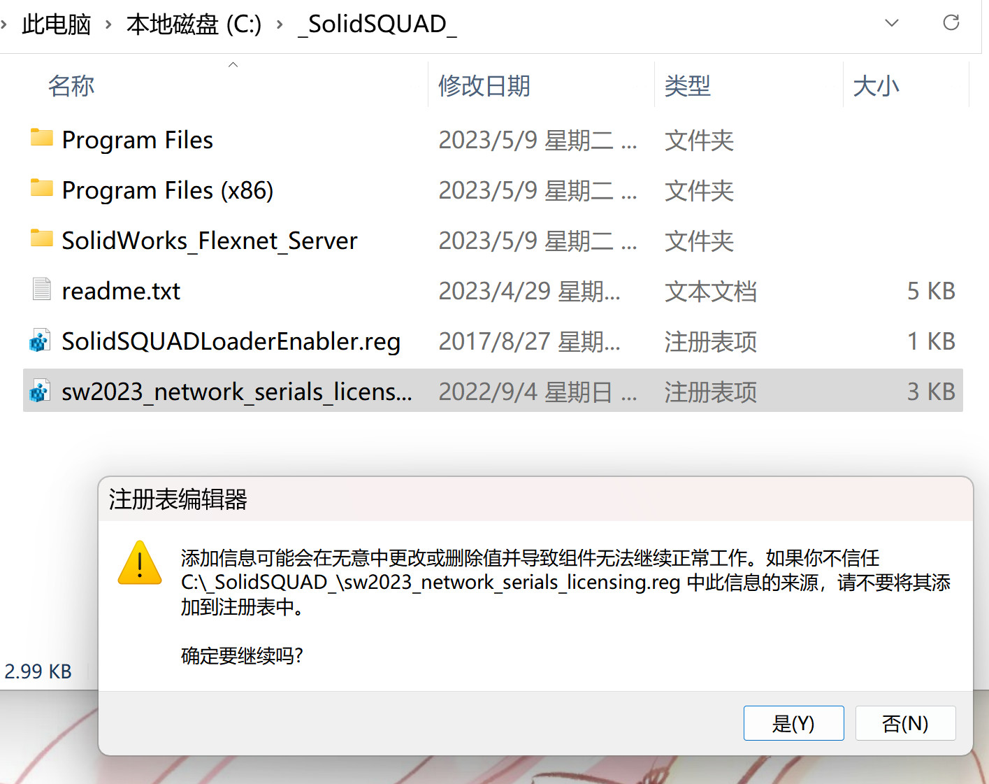 4、返回C盘_SolidSQUAD_文件夹,双击运行sw2023_network_serials_licensing.reg,然后点击是。