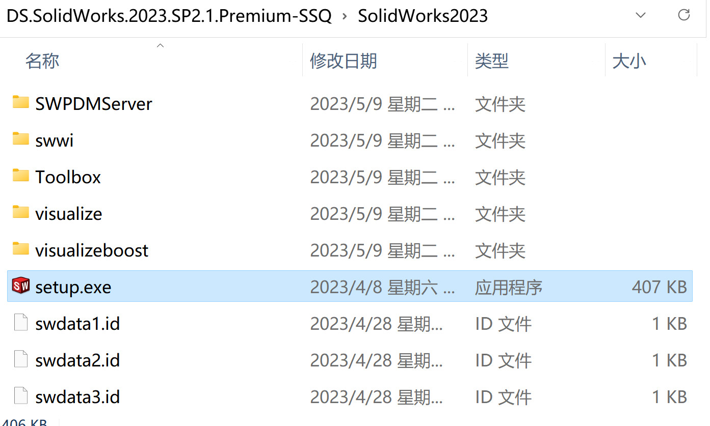 7、回到安装包,打开SolidWorks2023文件夹,双击setup.exe,开始安装SolidWorks。