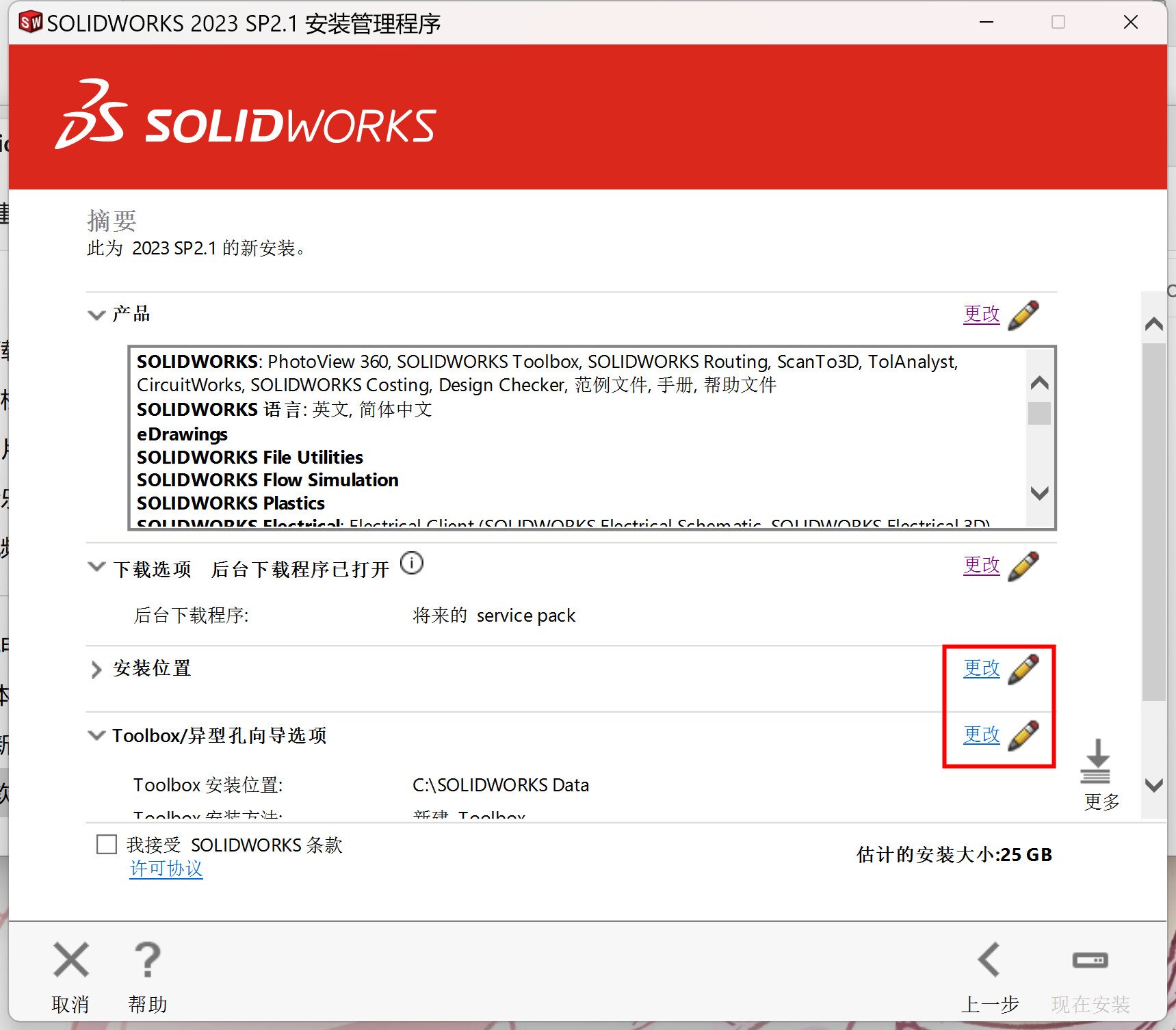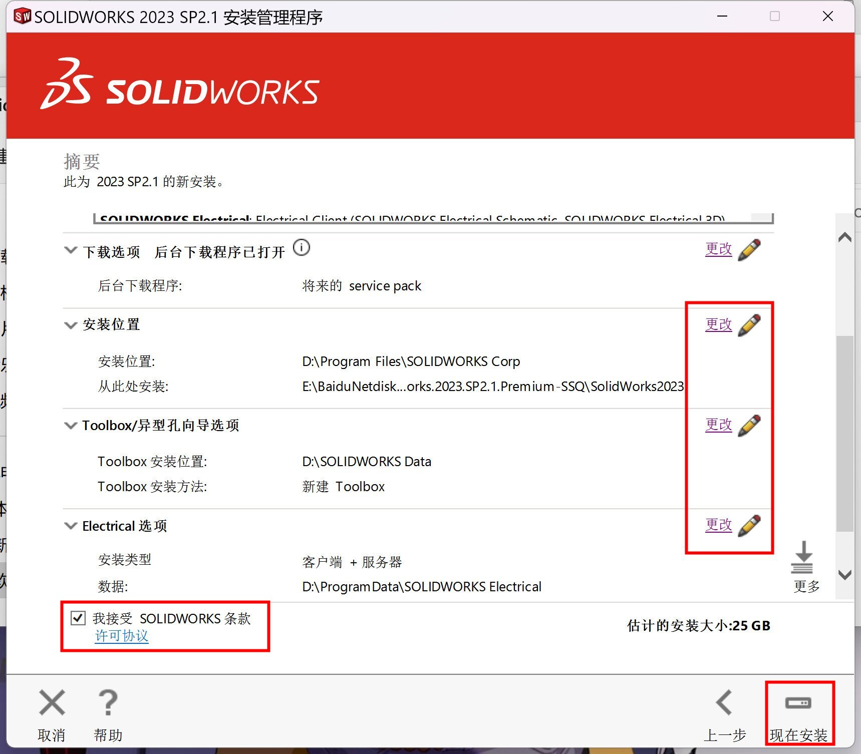 13、同上更改Toolbox与Electrical安装路径,勾选我接受,点击现在安装。