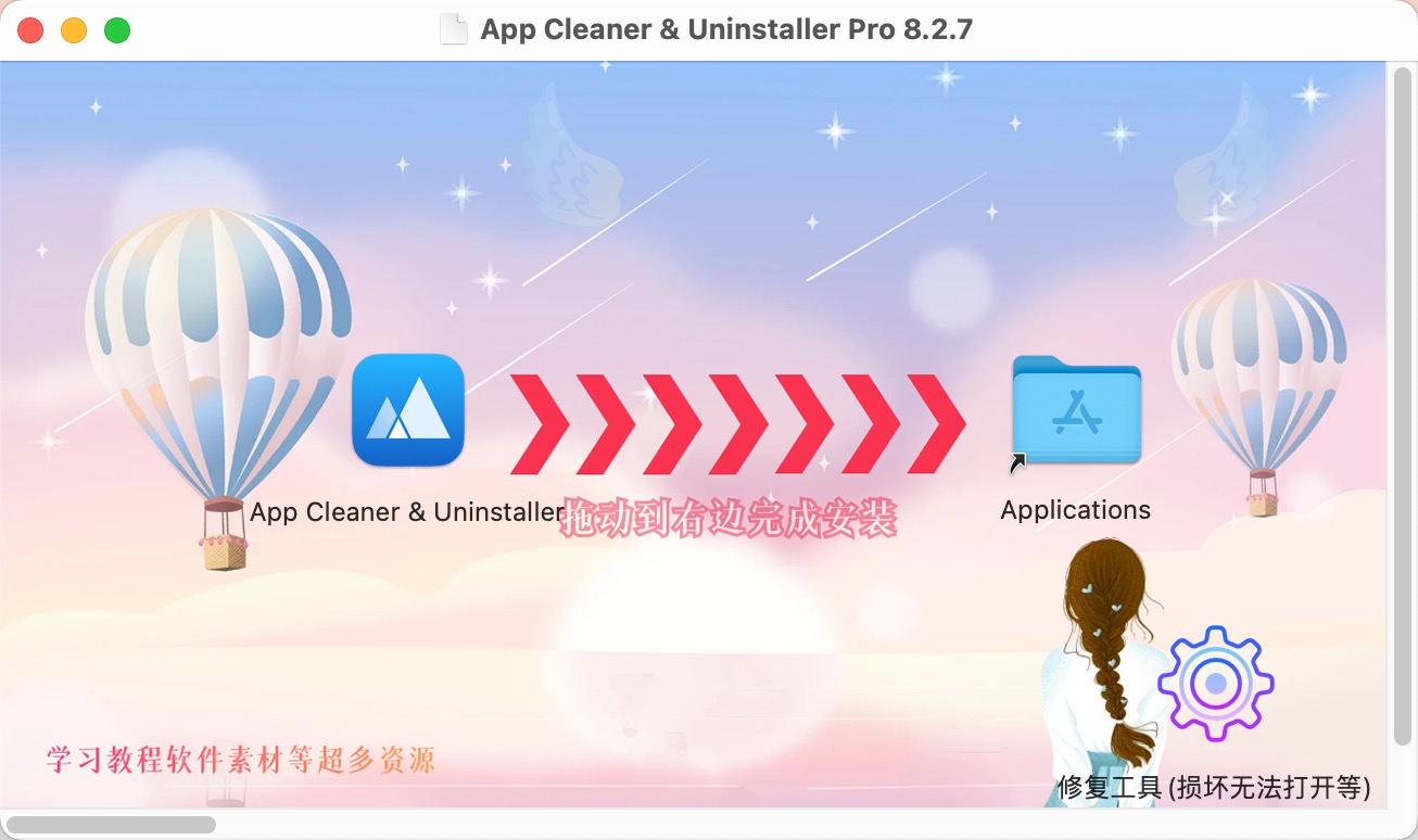 App Cleaner & Uninstaller安装包下载完成后打开,拖动左侧文件到右侧文件夹安装。