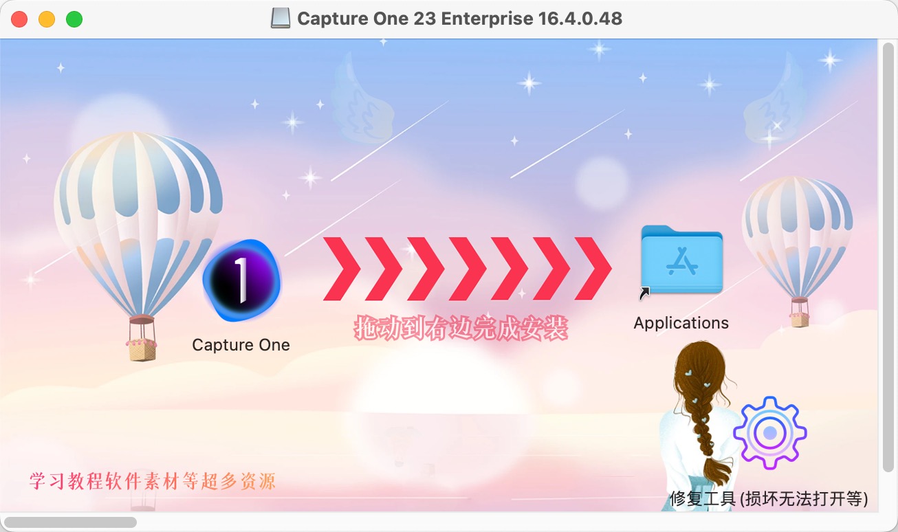 Capture One 23 Pro安装包下载完成后,拖动左侧的Capture One 23到右侧即可。