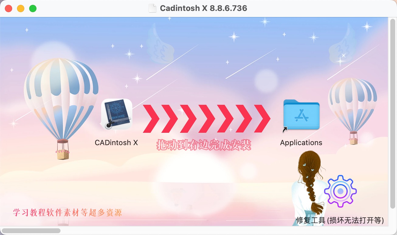 打开安装包,把左侧CADintosh X软件拖动到右边应用程序完成安装。