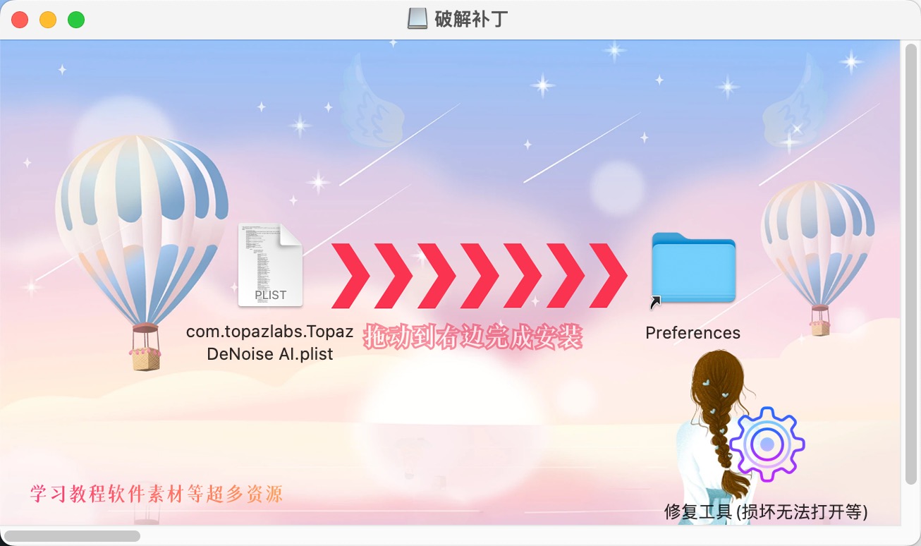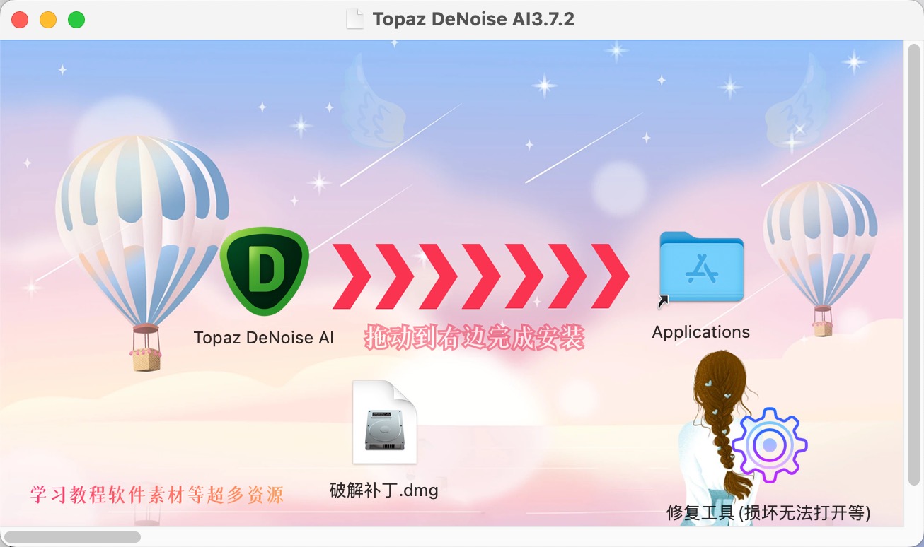 1、Topaz DeNoise AI安装包下载完成后,拖动左侧的Topaz DeNoise AI到右侧安装。