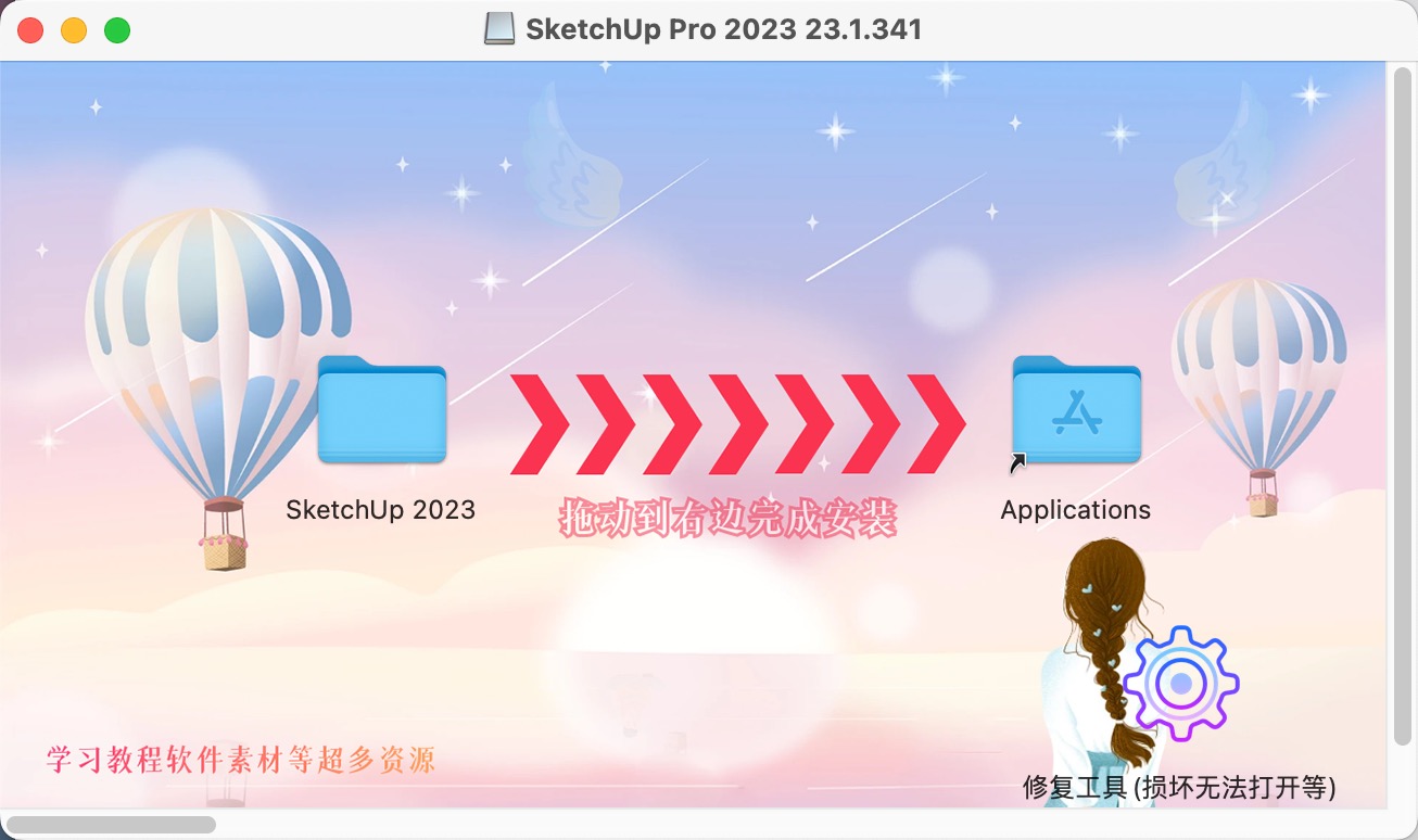 打开本站下载的SketchUp Pro 2023安装包,拖动软件SketchUp 2023到右边的应用程序中进行安装。