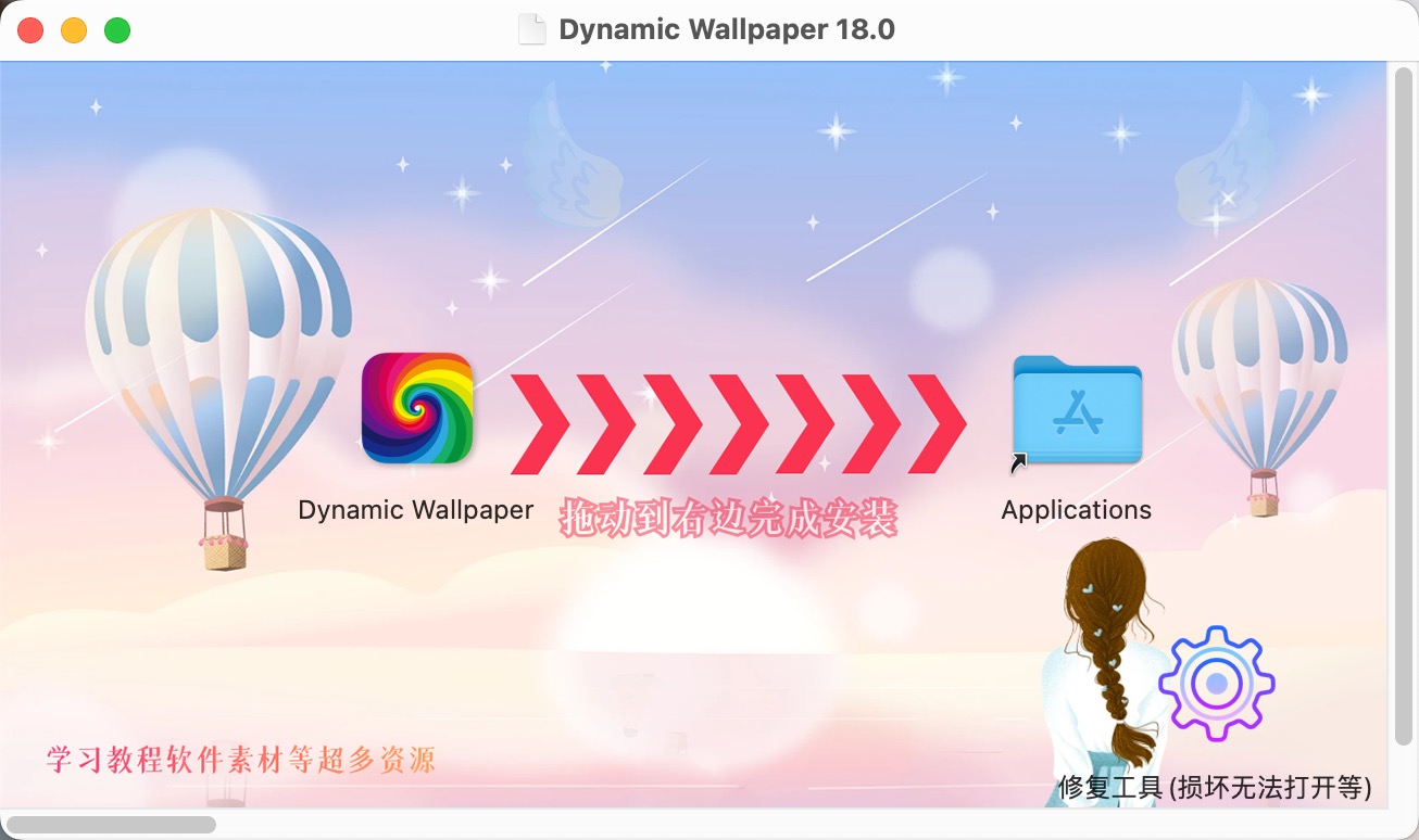 Dynamic Wallpaper 安装包下载完成后,拖动左侧的Dynamic Wallpaper 到右侧即可。