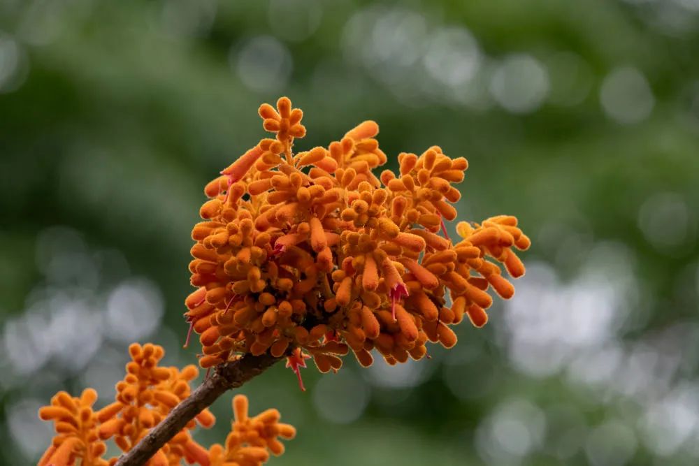 广西火桐为落叶乔木,该树种的物候独特,树叶萌发晚,先开花后长叶,树皮似厚皮树,树叶似三角枫,花蕊似炮仗花。每逢开花时节,花朵繁茂,鲜艳的花朵如同一串串鞭炮挂满枝梢。