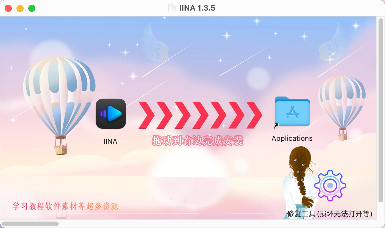 IINA安装包下载完成后,拖动左侧的IINA到右侧即可。