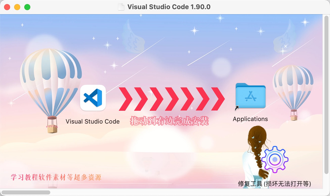 Visual Studio Code安装包下载完成后打开,拖动左侧的Visual Studio Code到右侧安装。
