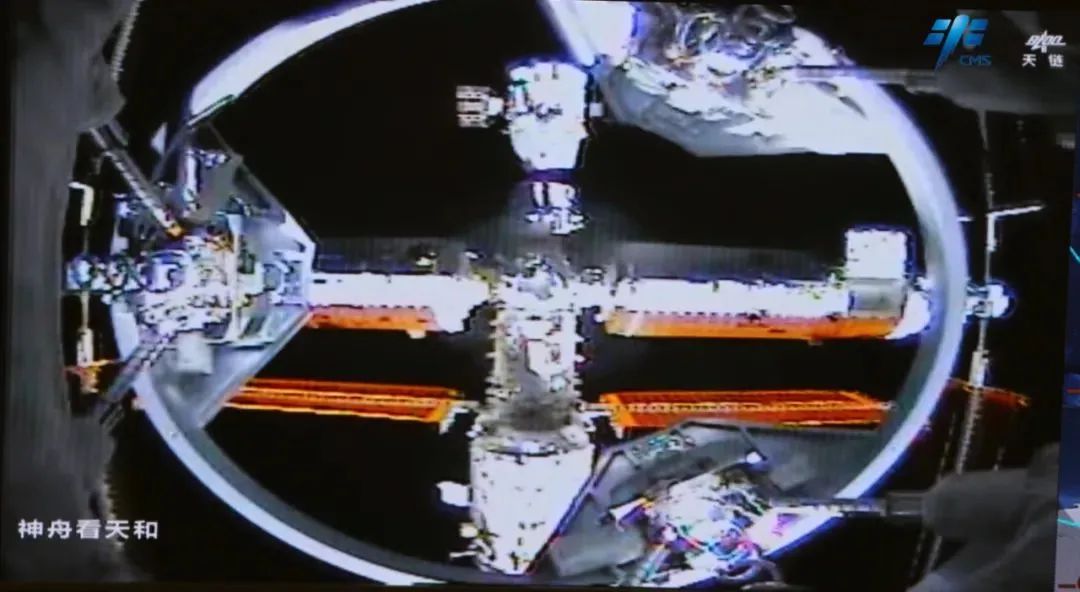 神舟十六号在进行径向交会对接任务时,将沿着天和核心舱下方的径向对接口逐渐靠近空间站组合体,从飞船的视角看,天和核心舱、问天实验舱、梦天实验舱、天舟六号货运飞船以及神舟十五号飞船均会出现在其视野中。