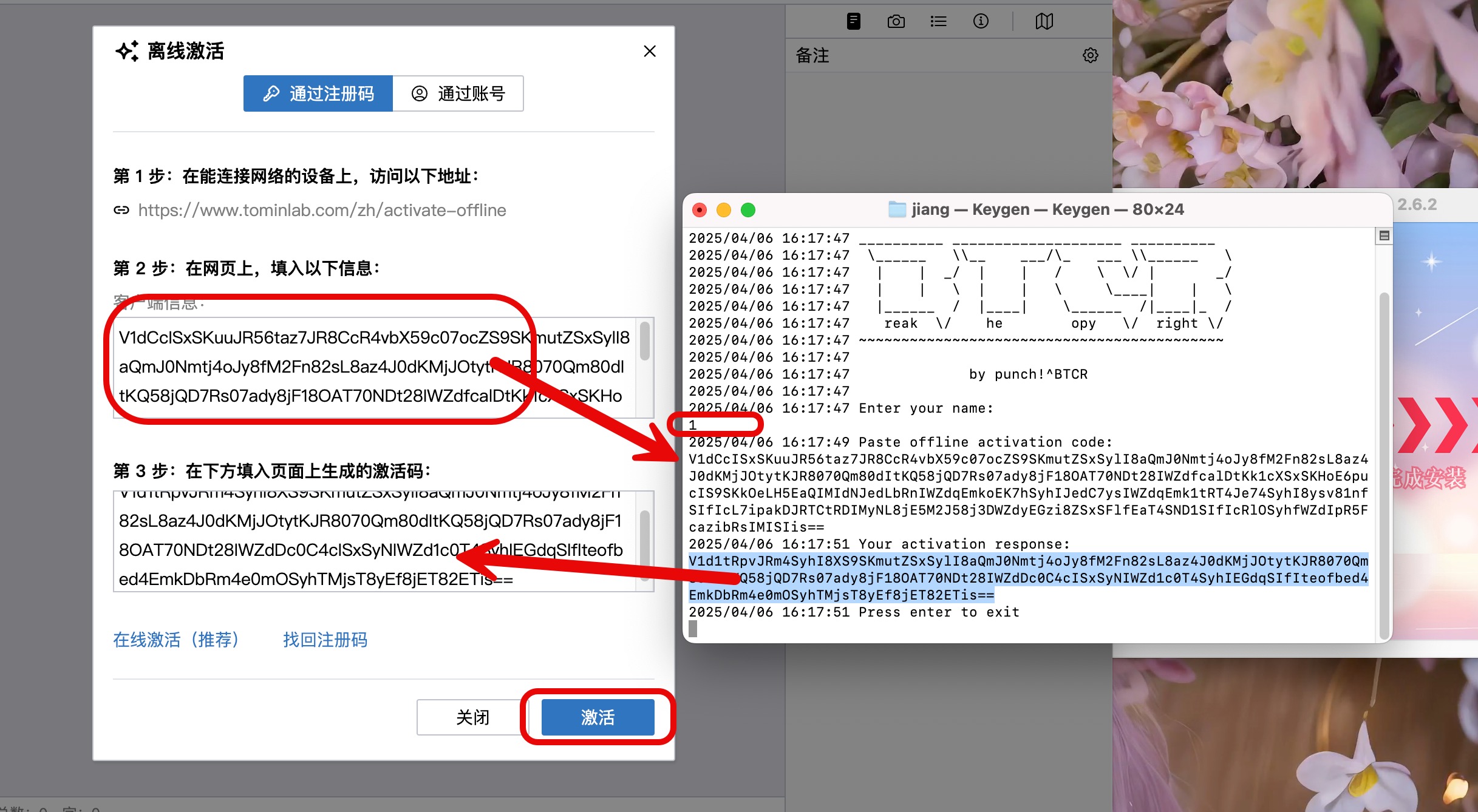 输入任意名称如1回车,如图,将「设备信息」粘贴至注册机界面回车,生成激活密钥,将生成的密钥粘贴至激活界面,点击「激活」。