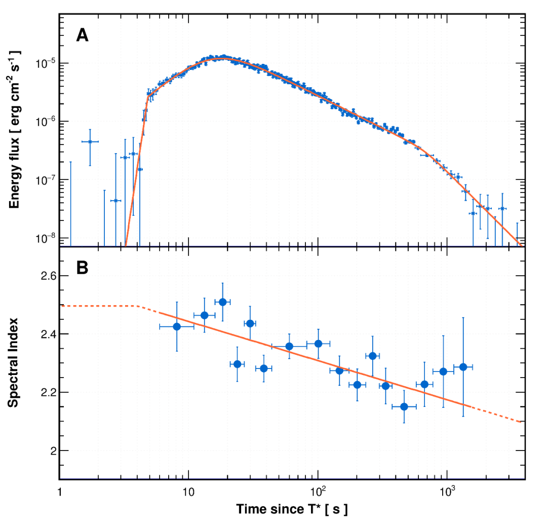 “拉索”观测到的3千亿到5万亿电子伏特能量范围的GRB 221009A余辉辐射的光变过程与能谱指数演化,以及函数拟合。