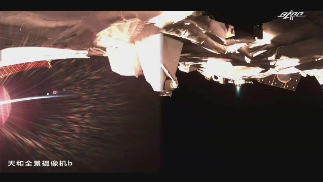 空间站电推进系统点火状态。“天和”核心舱舱外全景摄像机拍摄