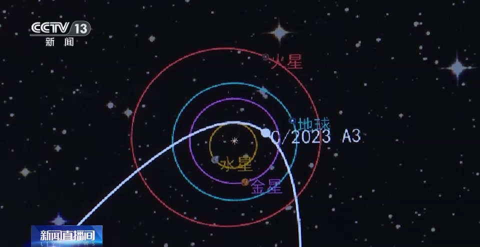 中科院紫金山天文台近地天体望远镜团组首席科学家 赵海斌:从它的轨道来看,是基本接近于抛物线在运行的轨道,1个轨道周期需要6万多年,距离太阳最近能到大概水星的距离,距离太阳最远能达到3000多个天文单位。地球和太阳的平均距离叫1个天文单位,相当于这个的3000多倍,所以这个轨道非常特殊。