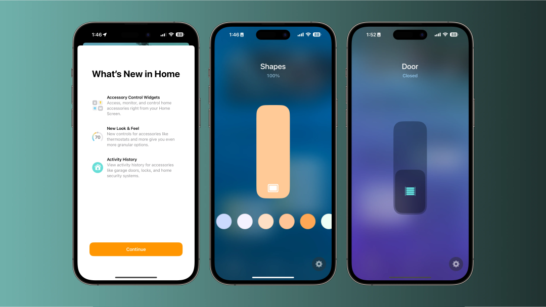 家庭应用增加新功能介绍,包括:配件控制小组件、全新观感、活动历史记录等等;新增了用于调整多色灯光颜色的更新滚动界面,增加了一些预设的颜色;车库门还有一个新的图标选项,总共有三种选择。