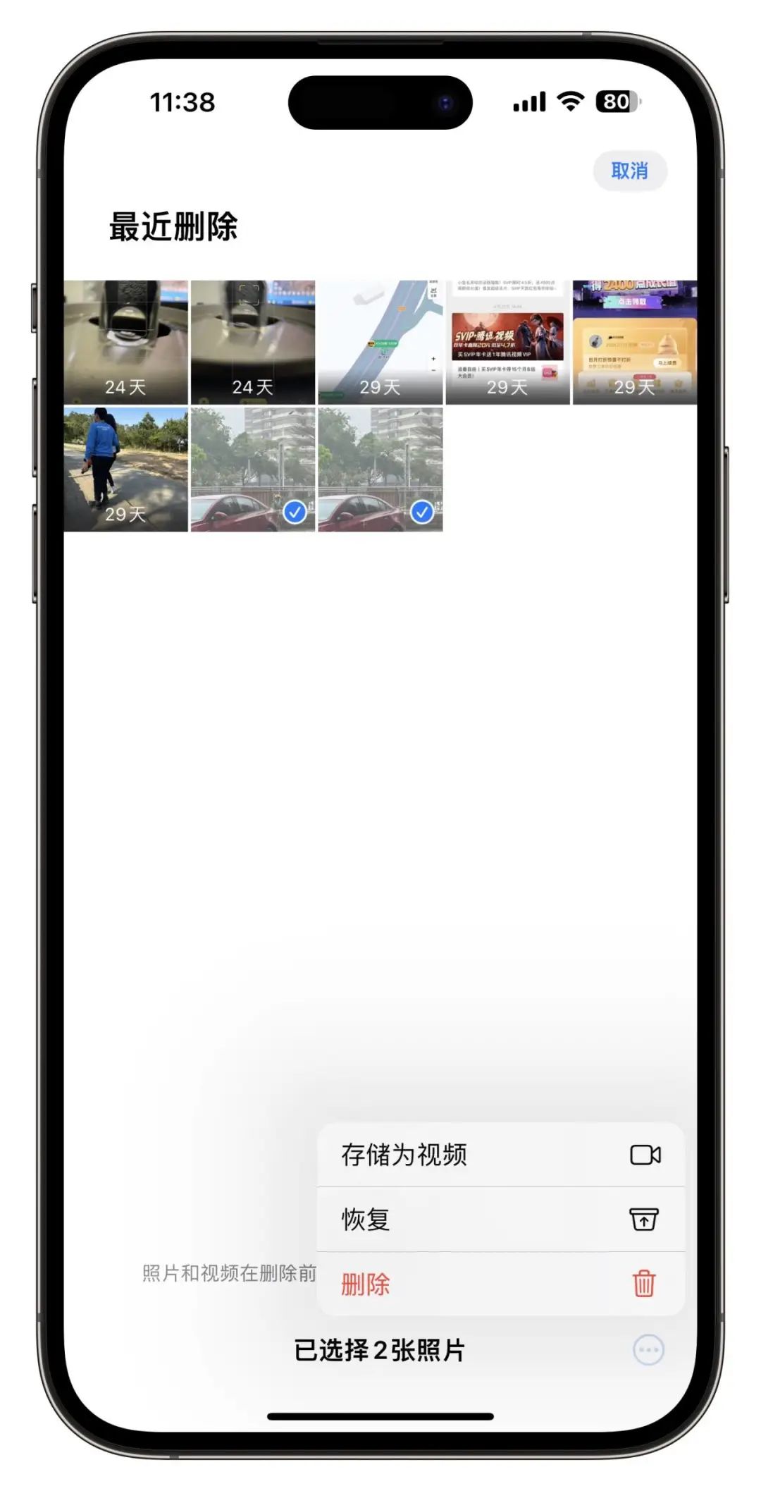 照片应用中调整了“最近删除”底部的按钮,从文字变成了菜单,并且在删除实况照片时会新增一个“存储为视频”的功能。