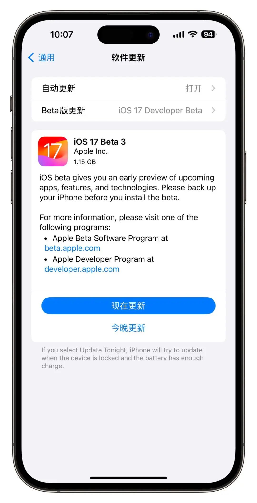今天凌晨,苹果为开发者预览版用户推送了iOS 17 Beta3测试版的更新,已经注册Apple Beta版软件计划的用户只需打开设置–通用–软件更新即可在线OTA升级至最新的iOS 17测试版。