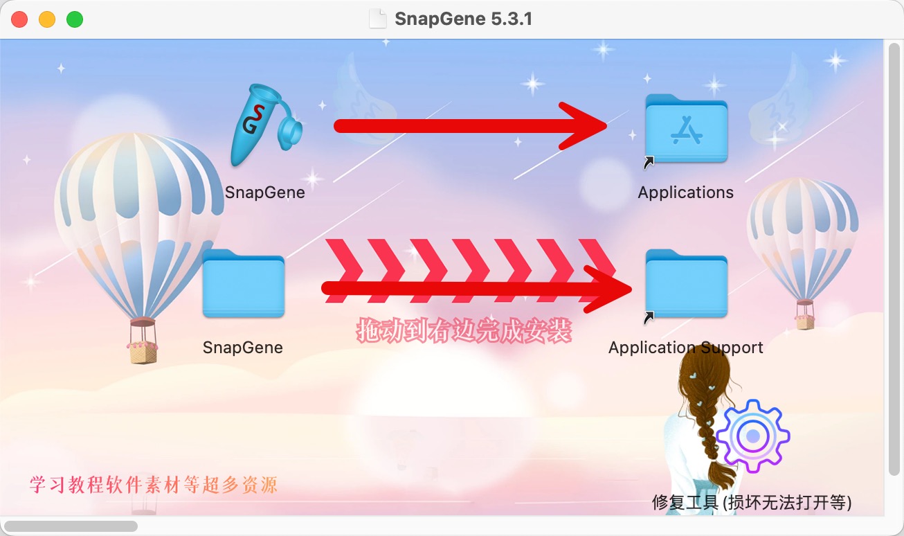 打开本站下载的SnapGene 5安装包,拖动左侧的SnapGene和SnapGene到右侧对应文件夹中(注:如果底下的Application Support拖不进去,可以双击打开Application Support文件夹,在放进去)。