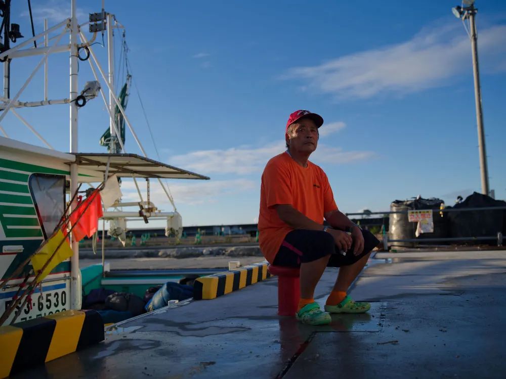 8月23日,打鱼归来的小野春雄坐在日本福岛县新地町的渔港。