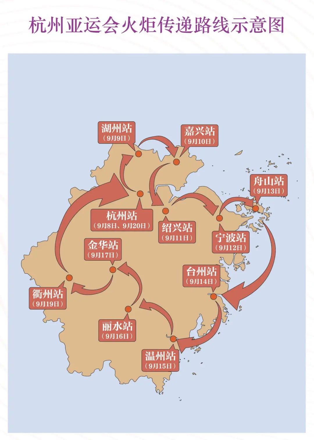9月8日到9月20日,亚运火炬“薪火”将会在杭州、湖州、嘉兴、绍兴、宁波、舟山、台州、温州、丽水、金华、衢州依次传递,9月20日再次回到杭州,完成最后一站传递。