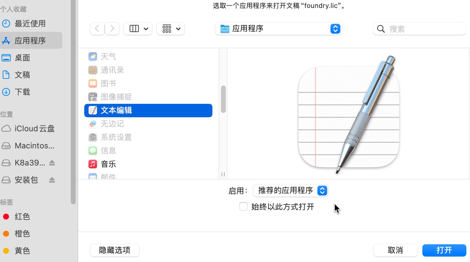 拖动安装后(左侧两个全部拖过去),应用程序中打开rlm_intel文件夹,找到foundry.lic右键打开,选择其他