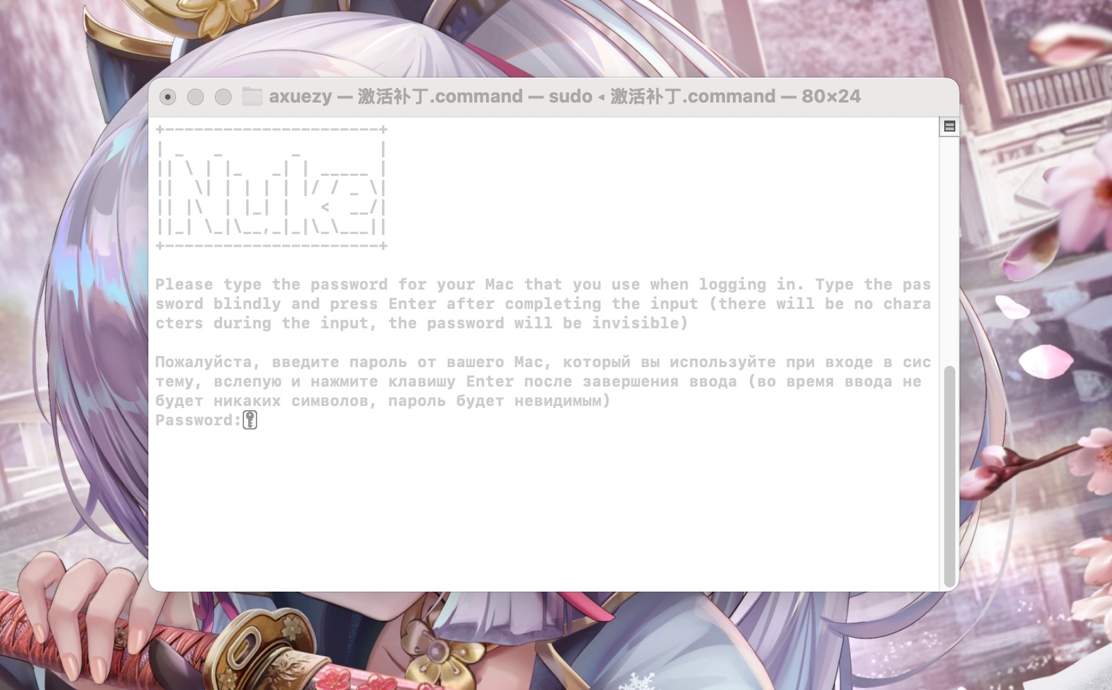 在打开的终端页面输入登录您Mac的密码(管理员密码)然后回车