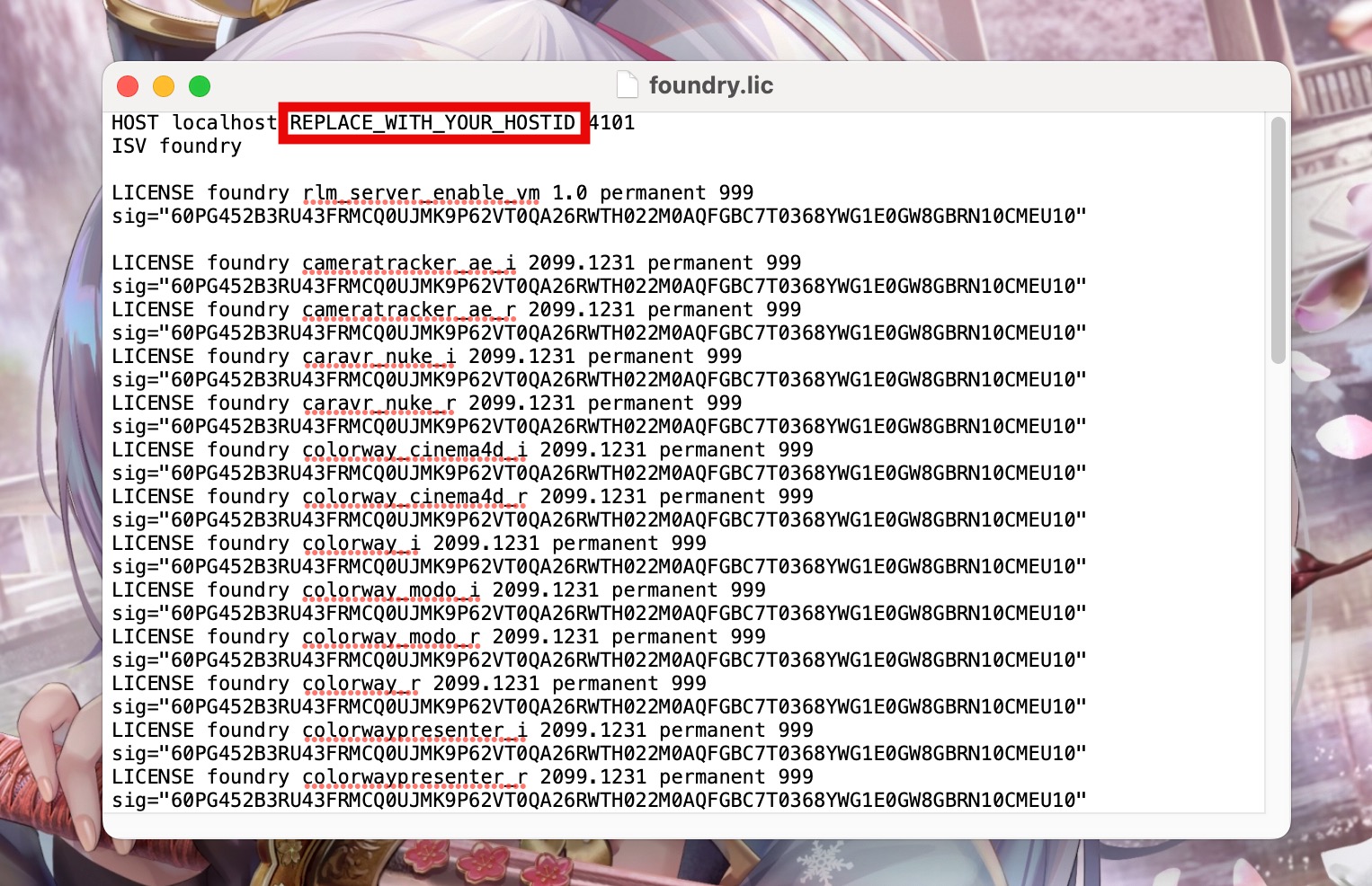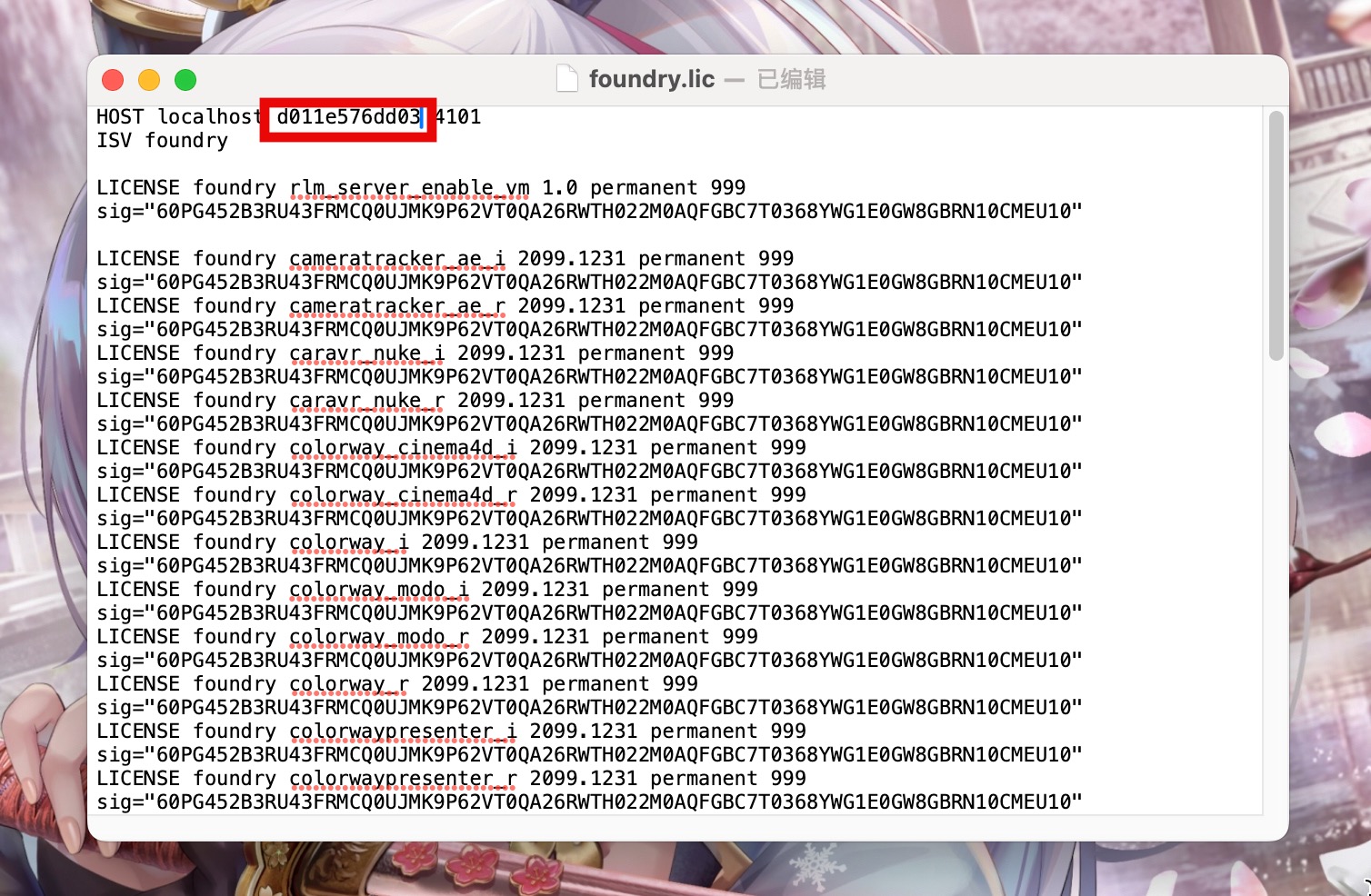 返回打开的foundry.lic界面,将您的mac地址去掉“:”后,覆盖红框内的HOSTID