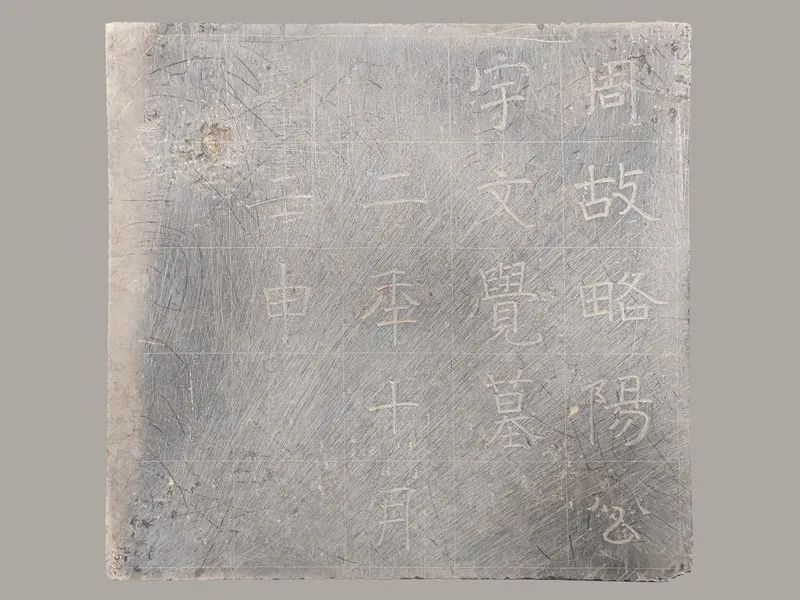 墓志置于墓室入口东侧,盖盝顶方形,素面无字。墓志正面楷书“周故略阳公宇文觉墓二年十月壬申”15字,并以朱砂描红。据墓志内容可确定墓主为北周开国皇帝孝闵帝宇文觉(542-557)。
