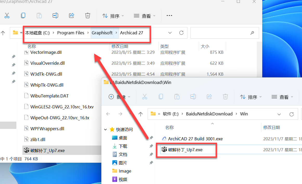 2、将破解补丁_Up7.exe复制到安装目录下C:\Program Files\Graphisoft\Archicad 27,运行破解补丁。
