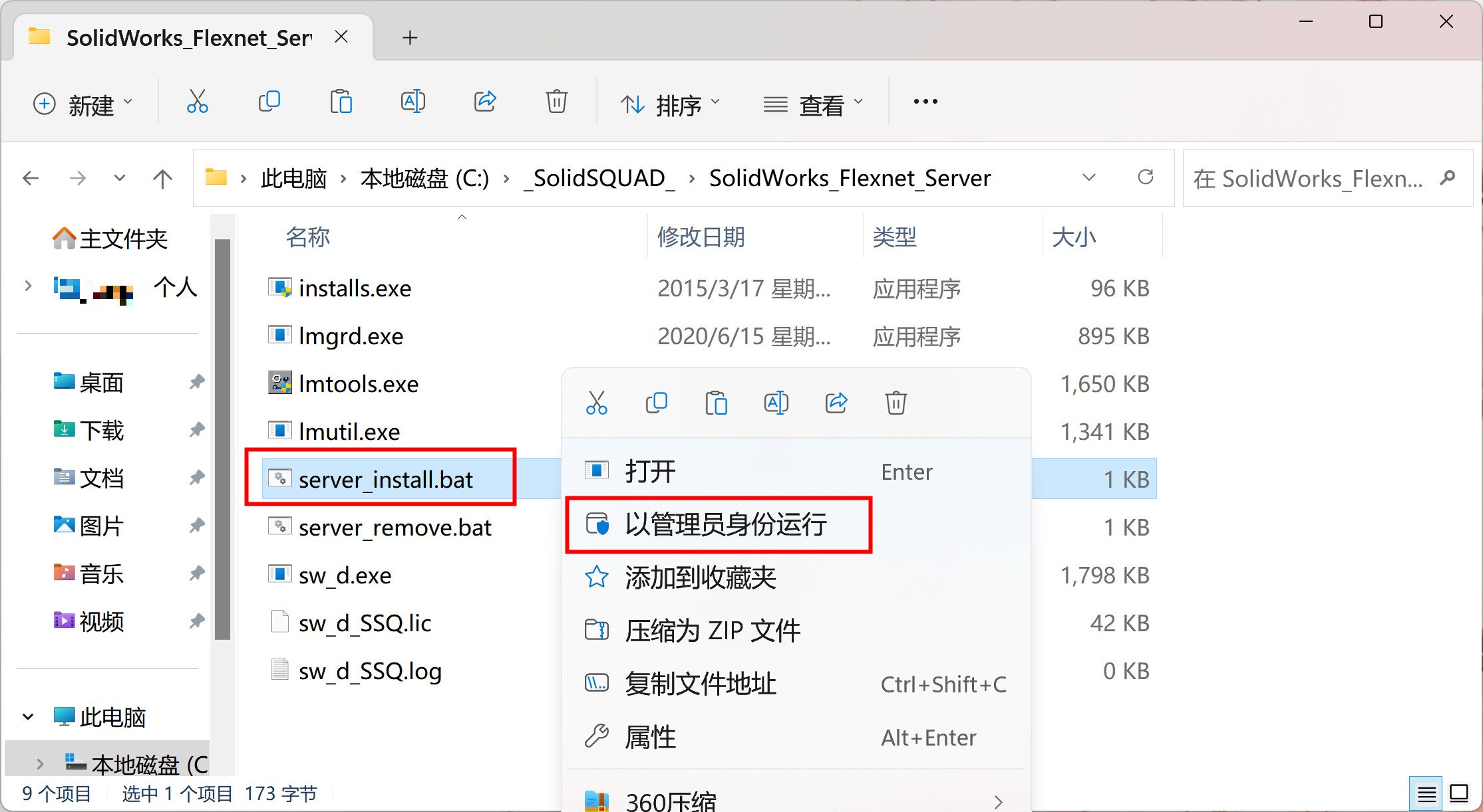 2、打开C盘的_SolidSQUAD_\SolidWorks_Flexnet_Server文件夹,右键管理员运行Server_remove.bat卸载SolidWorks_Flexnet_Serve(安装过旧版需要次步骤,首次安装可跳过),在鼠标右键以管理员身份运行server_install.bat。