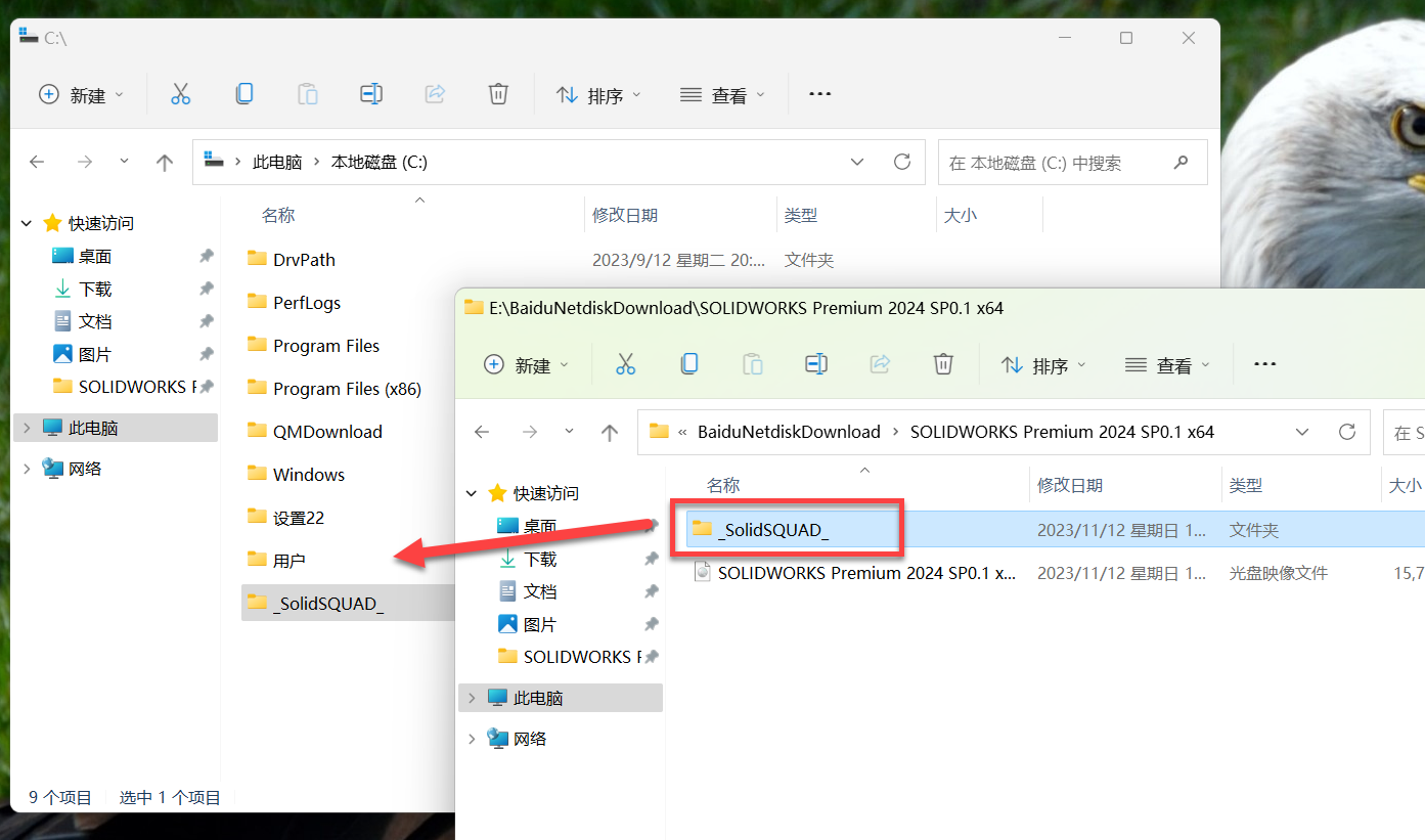1、打开在本站下载好的SolidWorks2025安装包并解压,将电脑C盘打开,然后将安装包里面的_SolidSQUAD_文件夹复制到C盘里面去。