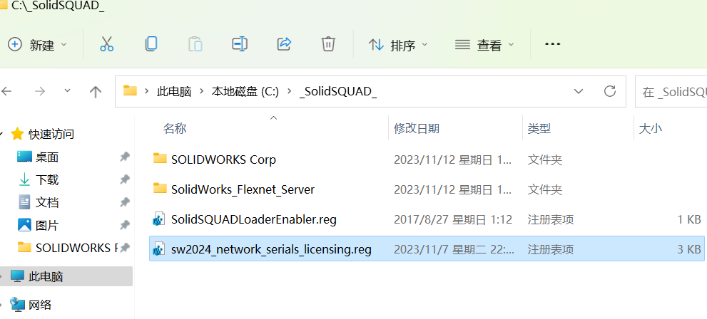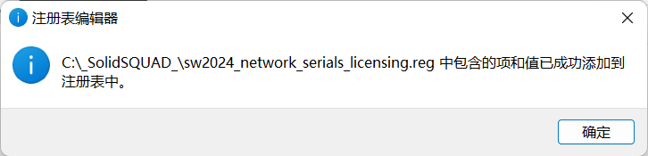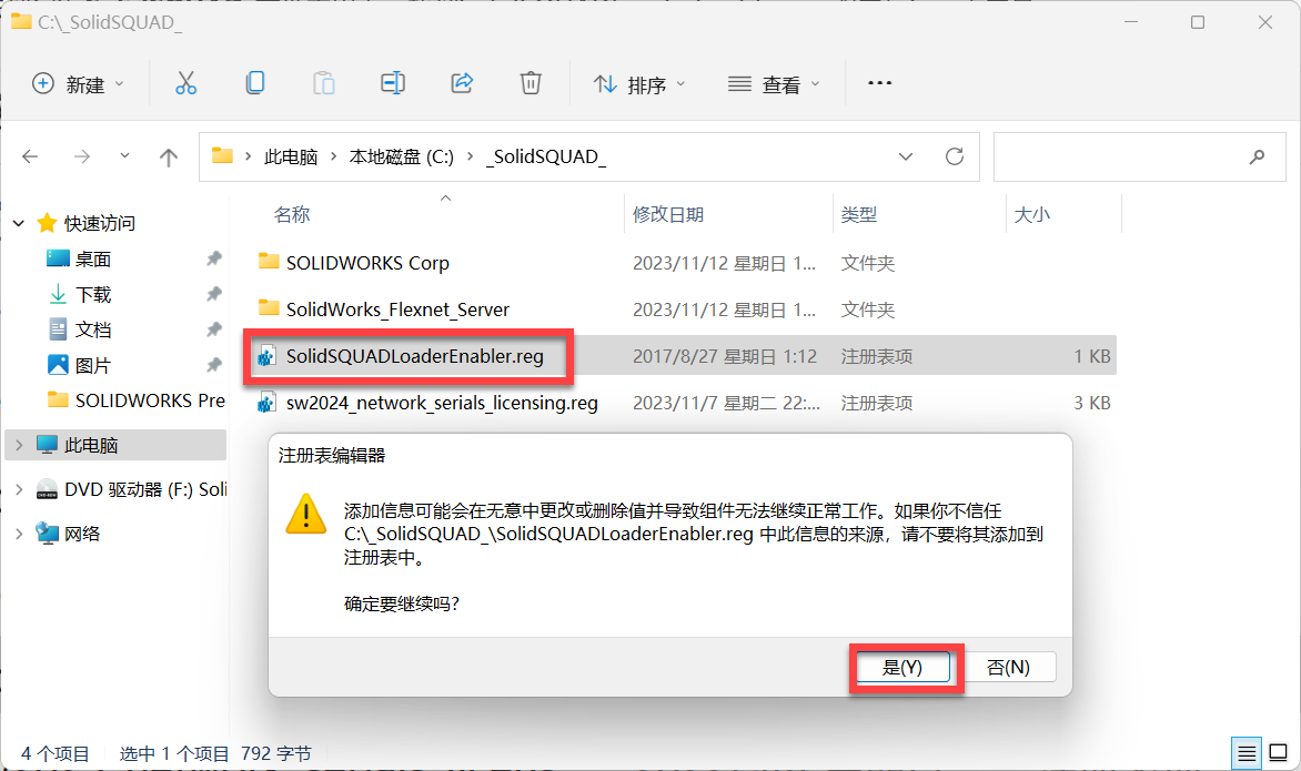 4、返回C盘_SolidSQUAD_文件夹,双击运行sw2025_network_serials_licensing.reg,然后点击是。
