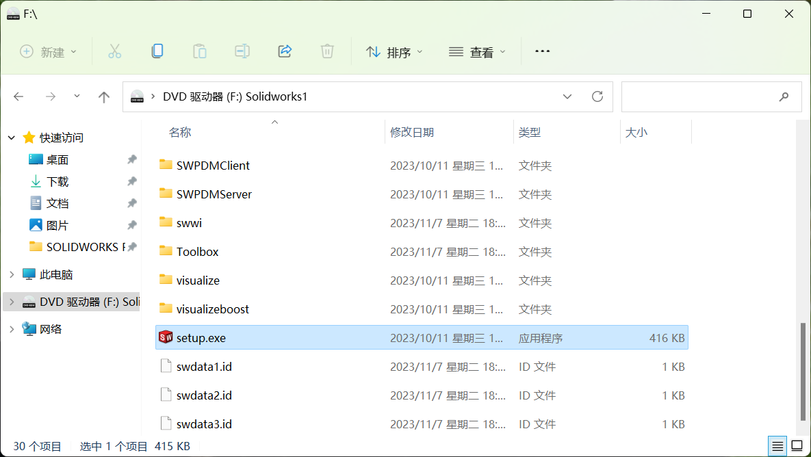 7、回到安装包,打开SOLIDWORKS Premium 2025 SP1.2 x64.iso镜像文件,双击setup.exe,开始安装SolidWorks。