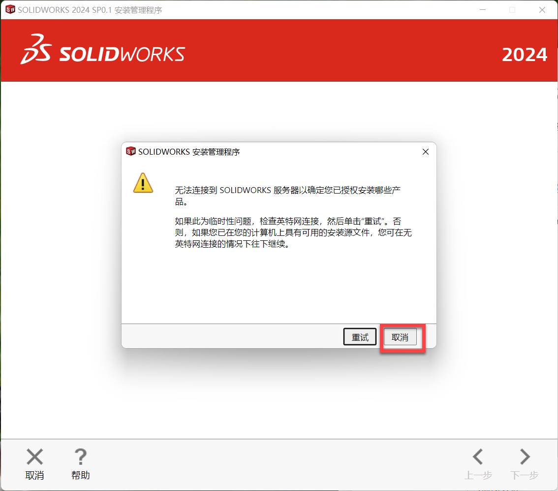 10、提示无法连接服务器,点击取消。