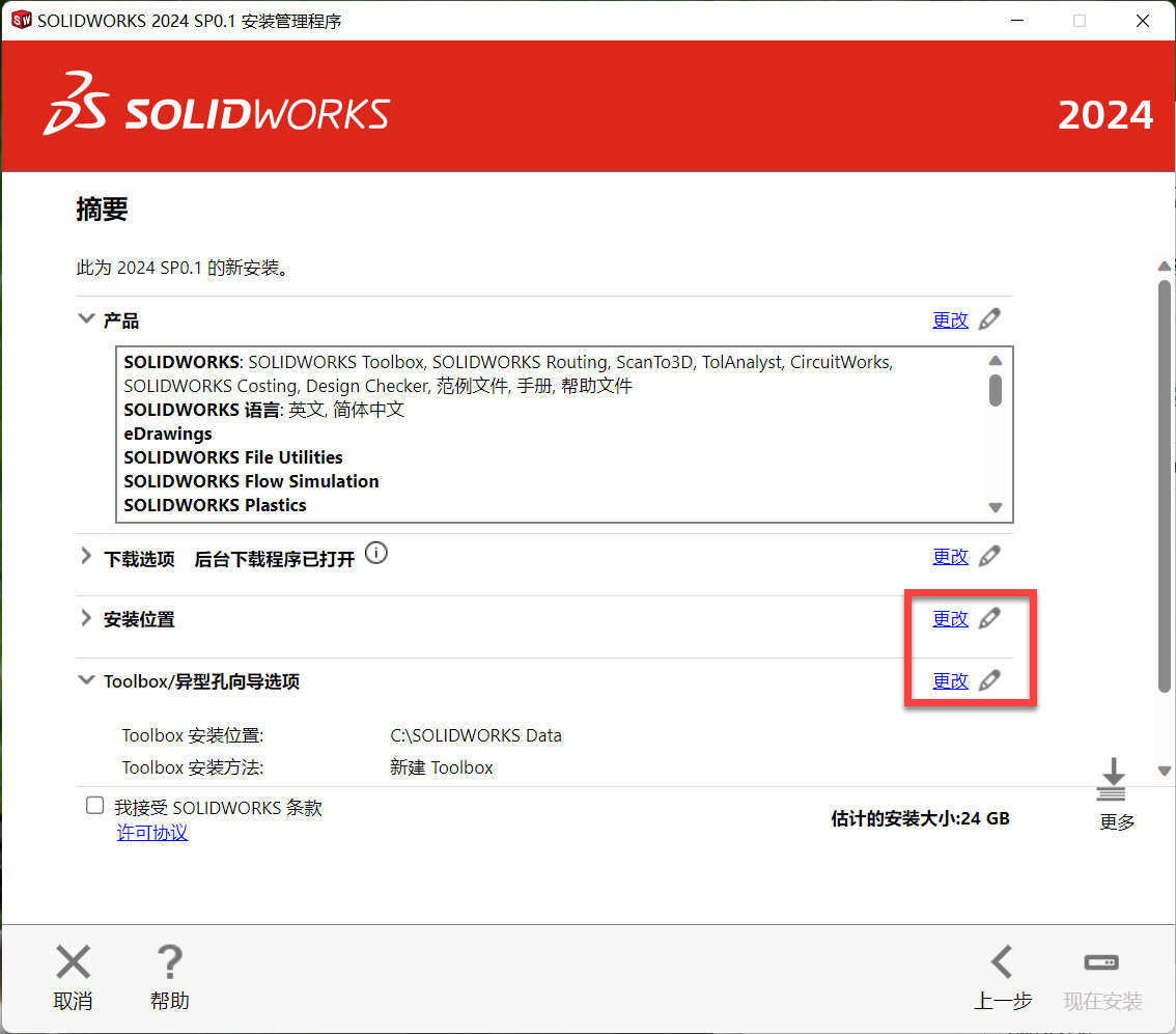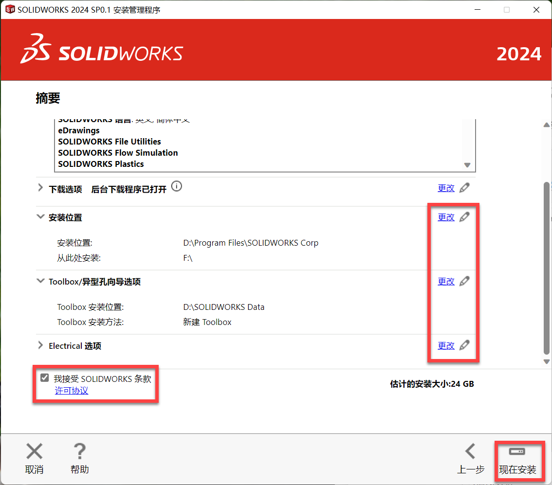 13、同上更改Toolbox与Electrical安装路径,勾选我接受,点击现在安装。