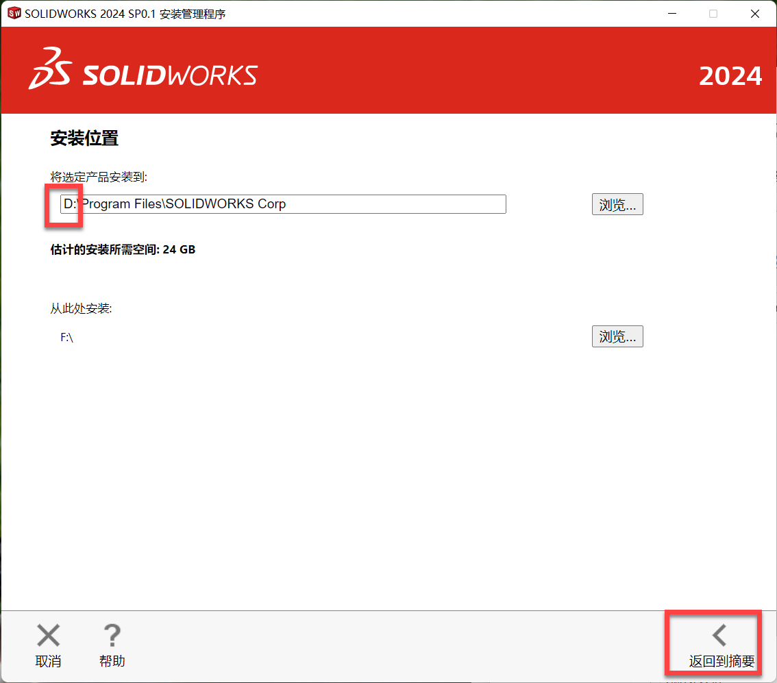12、点击更改,更改安装位置,确定安装位置之后点击返回到摘要即可!(安装位置后面要用到)。