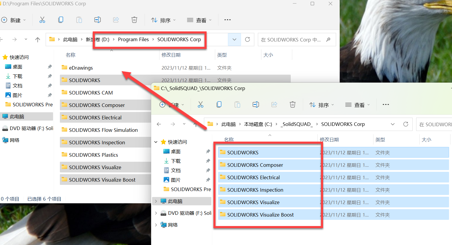 19、打开软件安装位置(如果前面步骤12更改了位置,就去到对应位置去),将_SolidSQUAD_\Program Files\SOLIDWORKS Corp里面的所有文件复制到安装位置里面去。