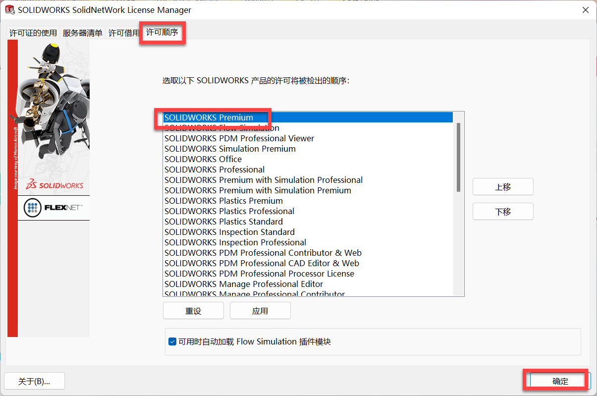 21、打开软件,依次点击右上角 问号?→SolidNetWork License Manager→许可顺序,选择SolidWorks Premium上移到顶部,点击应用→确定。