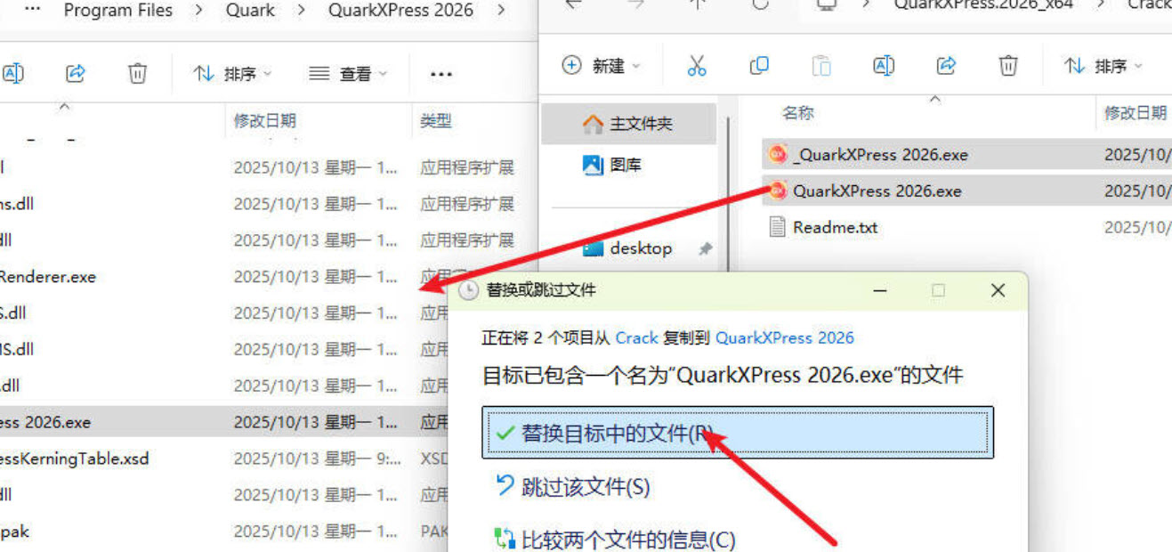 2026版返回安装包文件,选择点击“Crack ”文件夹,将下图的两个文件复制到安装目录下选择“替换,默认目录为C:\Program Files\Quark\QuarkXPress 2026