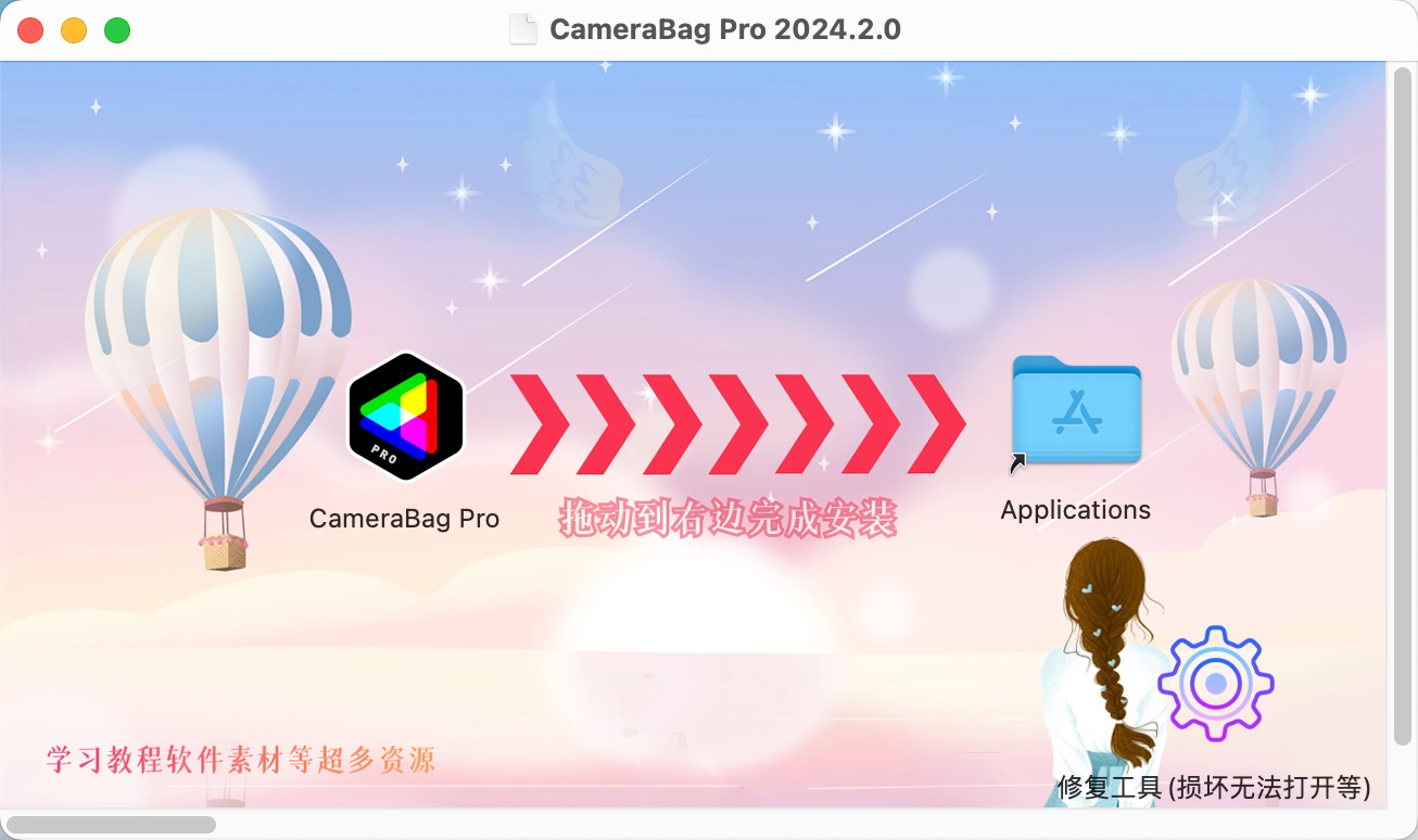 CameraBag Pro安装包下载完成后,拖动左侧的CameraBag Pro到右侧即可。