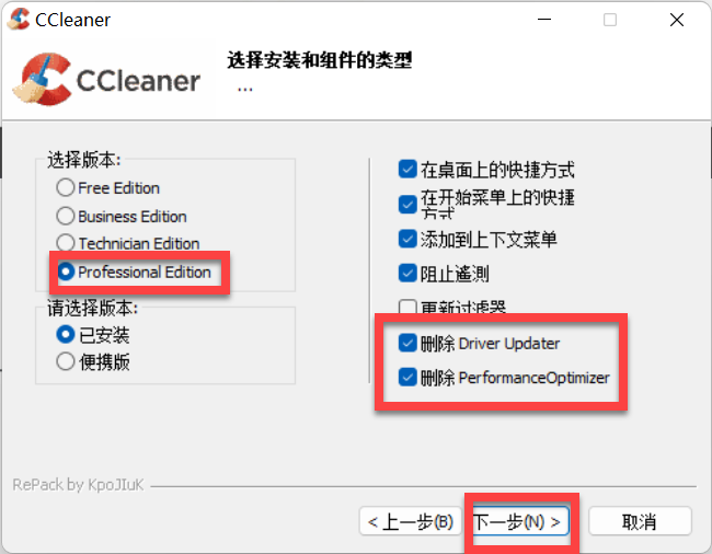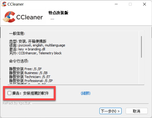 1、解压在本站下载好的CCleaner Professional安装包,双击CCleaner 6.18.10838.exe,取消勾选-安装推荐的软件,点击下一步。