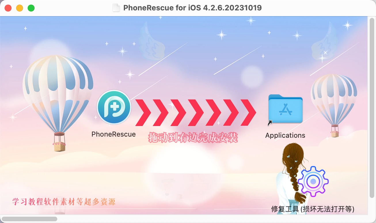 PhoneRescue安装包下载完成后,拖动左侧的PhoneRescue到右侧即可。