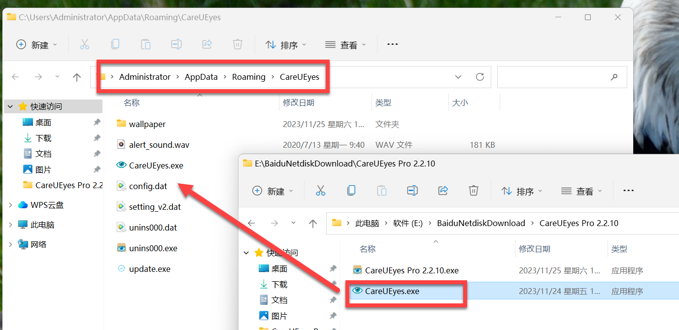 2、将CareUEyes.exe复制到安装目录下(快速打开:右键软件图标,打开软件所在位置)C:\Users\用户名\AppData\Roaming\CareUEyes。