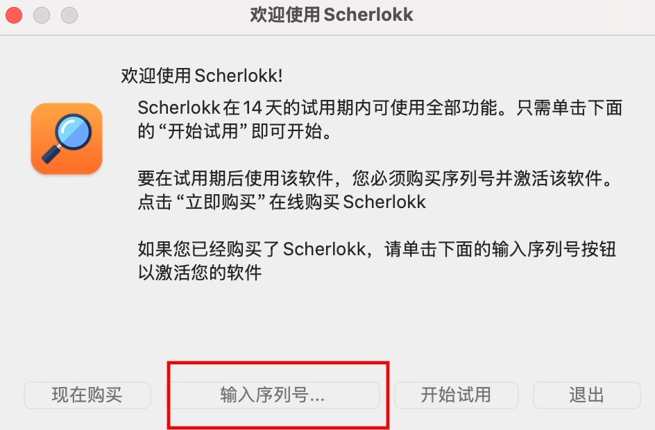 拖动安装后,打开软件,弹出试用提示点击下方的enter serial number...