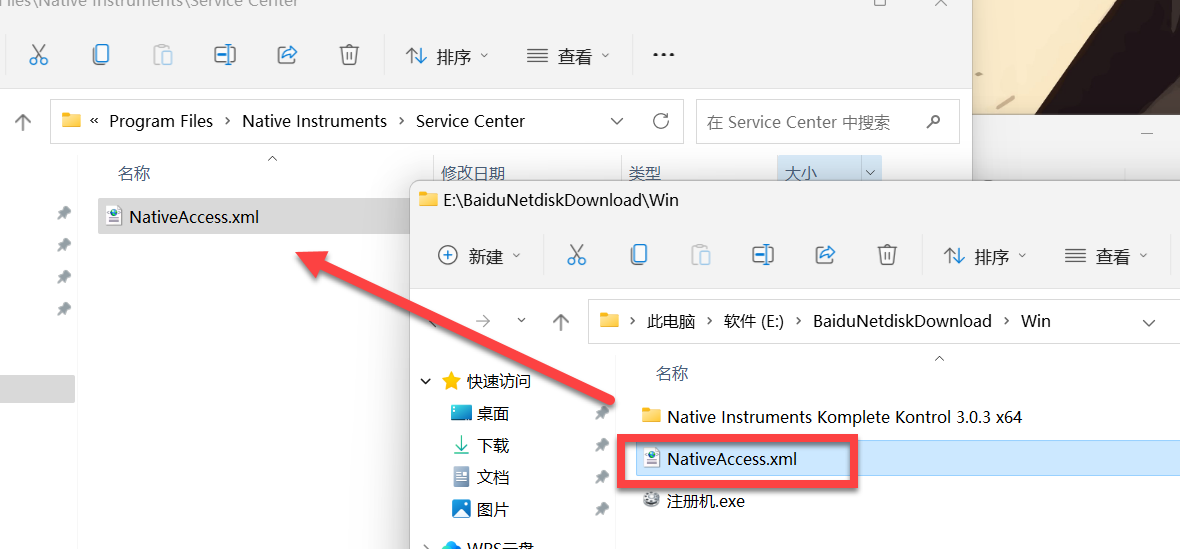 2、如果C:\Program Files\Common Files\Native Instruments中没有Service Center文件夹或Service Center中NativeAccess.xml大小不一样,请将NativeAccess.xml复制进。