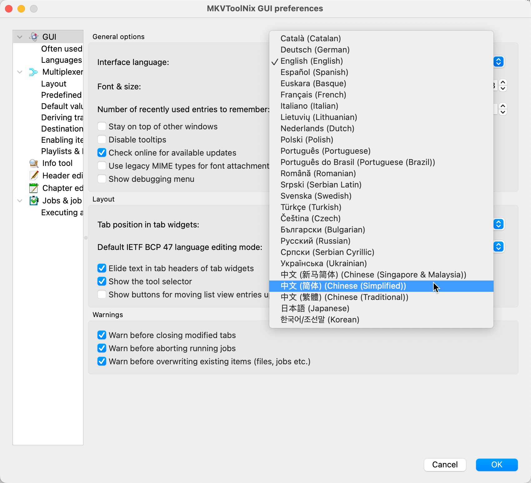 2、中文设置:依次点击左上角MKVToolNix>Preferences>GUI>中文 简体>OK
