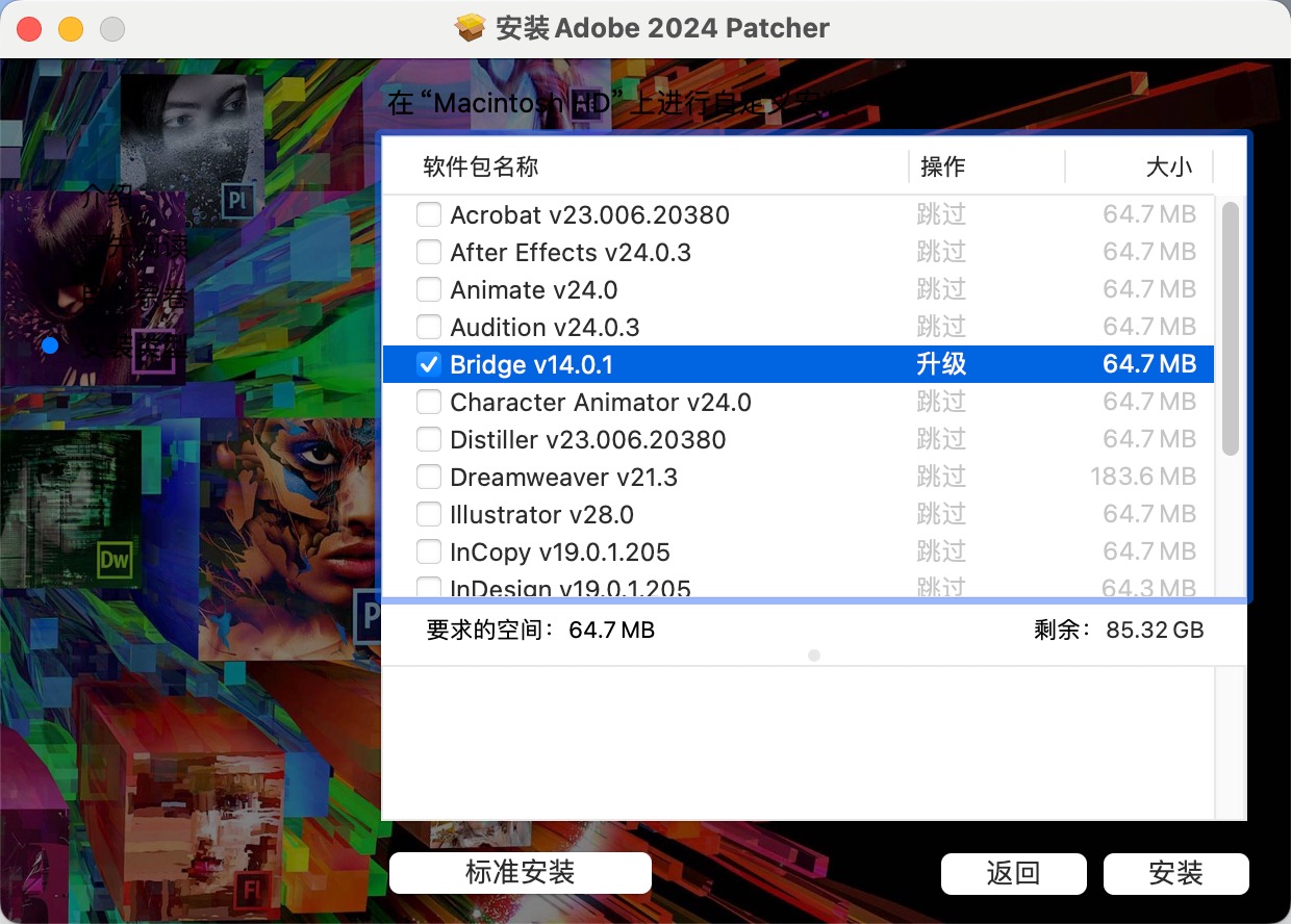 3、安装完成后,安装激活补丁,勾选Bridge v14.0.1,根据提示安装即可。安装完成后提示损坏,选择在访达中显示,右键软件打开。