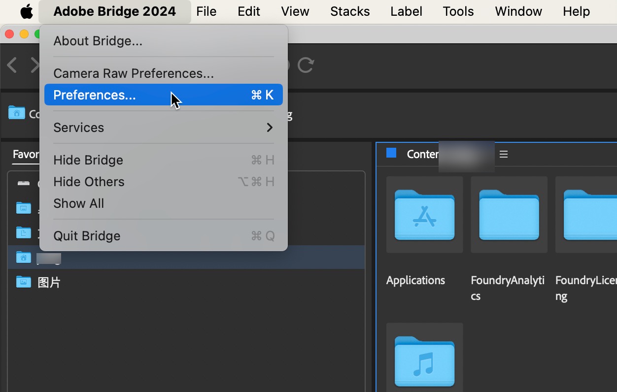 4、中文设置,打开软件点击菜单栏 Adobe Bridge 2024 点击 Preferencse